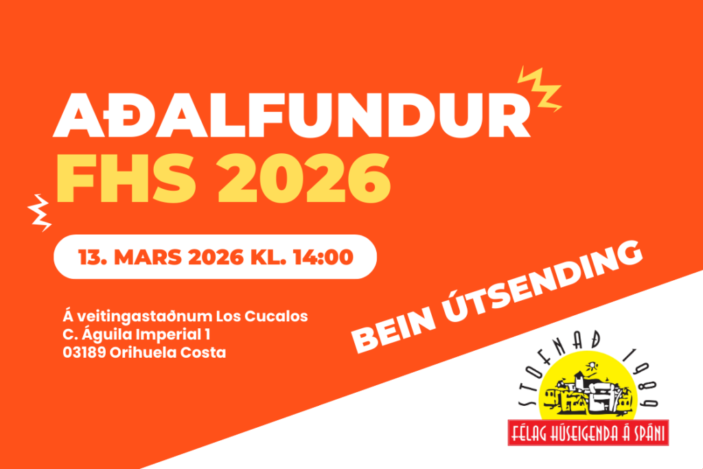 Aðalfundur Félags húseigenda á Spáni verður haldinn föstudaginn 13. mars 2026 kl. 14:00 á veitingastaðnum Los Cucalos, C. Águila Imperial, 1, 03189 Orihuela Costa. Til að sitja fundinn þarf félagsgjald 2026 að vera greitt. Venjuleg aðalfundarstörf. Lagabreytingar.